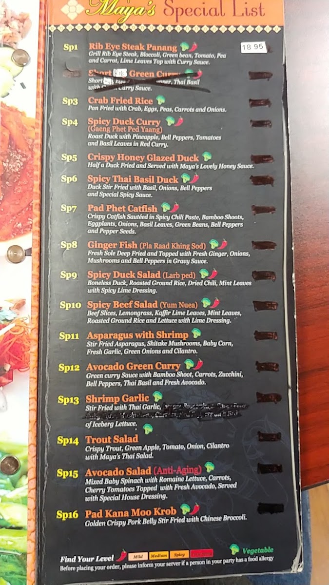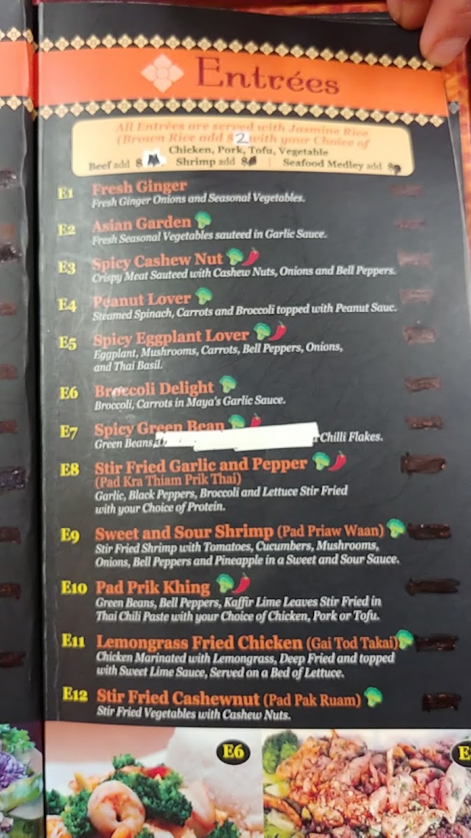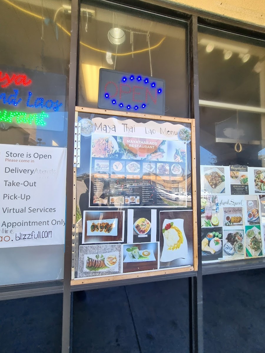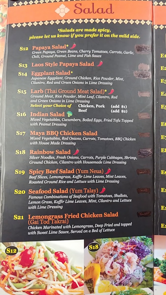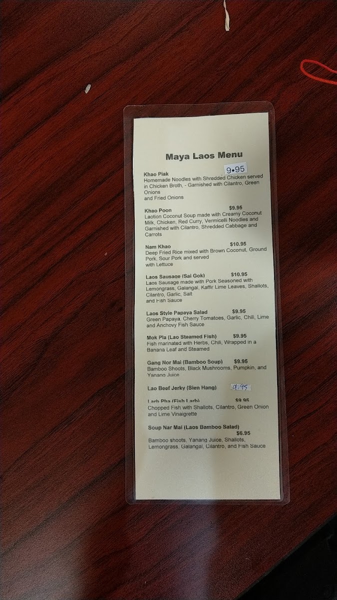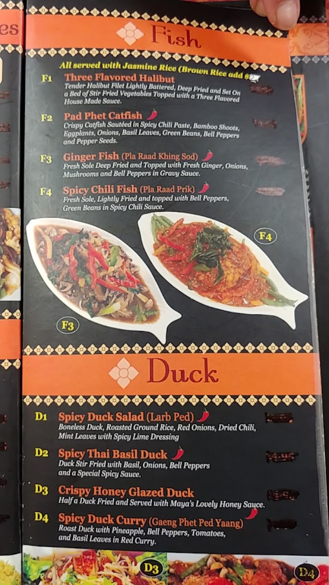 Maya Thai Laos Restaurant at 3550 San Pablo Dam Rd in El Sobrante offers a menu that is both diverse and enticing, catering to lovers of Southeast Asian cuisine. For starters, the Appetizers like Maya Combo, Basil Wontons, and Prawn Rolls set a flavorful tone, while Crispy Calamari and Curry Puffs offer lighter, satisfying bites. The Soups section features hearty choices such as Khao Piak, Glass Noodle Soup (Large Size), Laos Khao Soi, and the aromatic Tom Yum (Large Size) and Tom Yum Noodle Soup. Fans of duck are treated to rich dishes like Spicy Duck Curry (Gaeng Phet Ped Yaang), Spicy Duck Salad / Larb Ped, Crispy Honey Glazed Duck, and Spicy Thai Basil Duck. Entrées like Spicy Cashew Nut, Fresh Ginger, Stir-Fried Cashew Nut / Pad Pak Ruam, Spicy Basil, and Peanut-Lover showcase the restaurant’s knack for balancing spice and flavor. Fish lovers can enjoy Pad Phet Catfish, Spicy Chili Fish / Pla Raad Prik, or Ginger Fish / Pla Raad Khing Sod, each prepared with bold seasoning. The Curry offerings, including Yellow Curry, Choo Chee Salmon, Green Curry, Pumpkin Curry, and Mango Shrimp Curry, are complemented by sides like Steamed Vegetables, Jasmine Rice, Steamed Noodles, Brown Rice, and Sticky Rice. Salads such as Trout Salad, Rainbow Salad / Yum Woon Sen, Seafood Salad / Yum Talay, Spicy Beef Salad / Yum Nuea, and Thai Papaya Salad bring fresh, zesty notes to the menu. Pan-fried dishes are well represented with Crab Fried Rice, Chinese Sausage Fried Rice / Khao Pad Kun Chiang, Pineapple Fried Rice, and Lemongrass Fried Chicken Over Fried Rice / Gai Tod Takrai, while noodle lovers can choose from Pad See Ew, Pad Thai, or Drunken Noodle / Pad Kee Mao. To finish, the desserts such as Fried Banana With Ice Cream, Roti With Ice Cream, and Mango With Sticky Rice Ice Cream provide a sweet conclusion. Beverages like Thai Iced Coffee, Thai Iced Tea, Pepsi, Sprite, and Regular Iced Tea round out the menu, making it a comprehensive and flavorful experience for every palate.